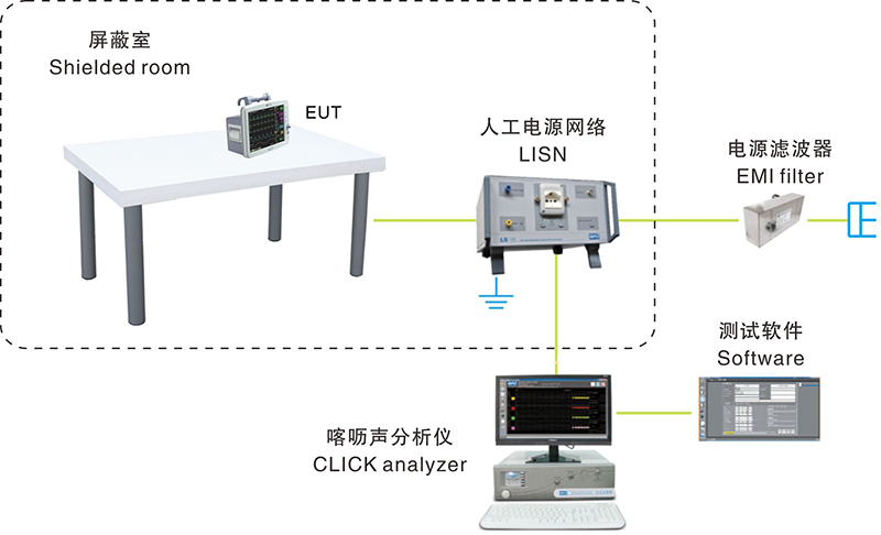 喀嚦聲屬于傳導騷擾測試,測試端口與傳導連續(xù)騷擾一致。喀嚦聲測試需要哪些測試設備呢?下圖是我司推薦的喀嚦聲測試的標準方案,由于喀嚦聲測試對信號的采集、分析與連續(xù)騷擾不同,故常規(guī)的接收機已不能滿足喀嚦聲測試要求,這里我們就需要用到喀嚦聲分析儀。在耦合單元方面喀嚦聲測試與連續(xù)騷擾還是一致的,常規(guī)電源端口使用LISN,信號端、負載端和高壓大電流電源端使用電壓探頭。測試環(huán)境需要使用屏蔽室環(huán)境。