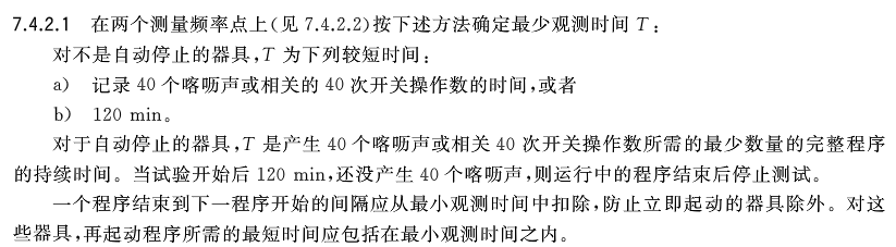 標準上根據設備的運行狀態(tài),將設備分為兩類:一種是一直運行的設備,另一種是自動停止的設備。當設備是一直運行的設備如冰箱,當設備運行120min還未觀測到40個喀嚦聲或者40次開關次數(shù),則測試停止,或者在120min中之內也觀測到40個喀嚦聲或者40次開關次數(shù),則測試停止。當設備是自動停止的設備如洗衣機,判定依據還是一致的,我們需要保證觀測時間內包含最小數(shù)量的完整程序且一個程序結束和下一個程序開始的間隔是需要扣除的。